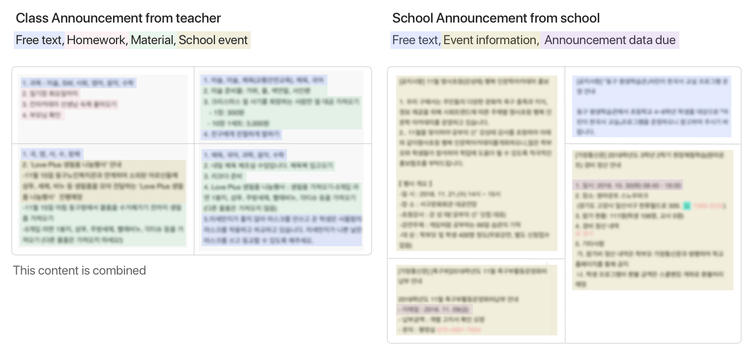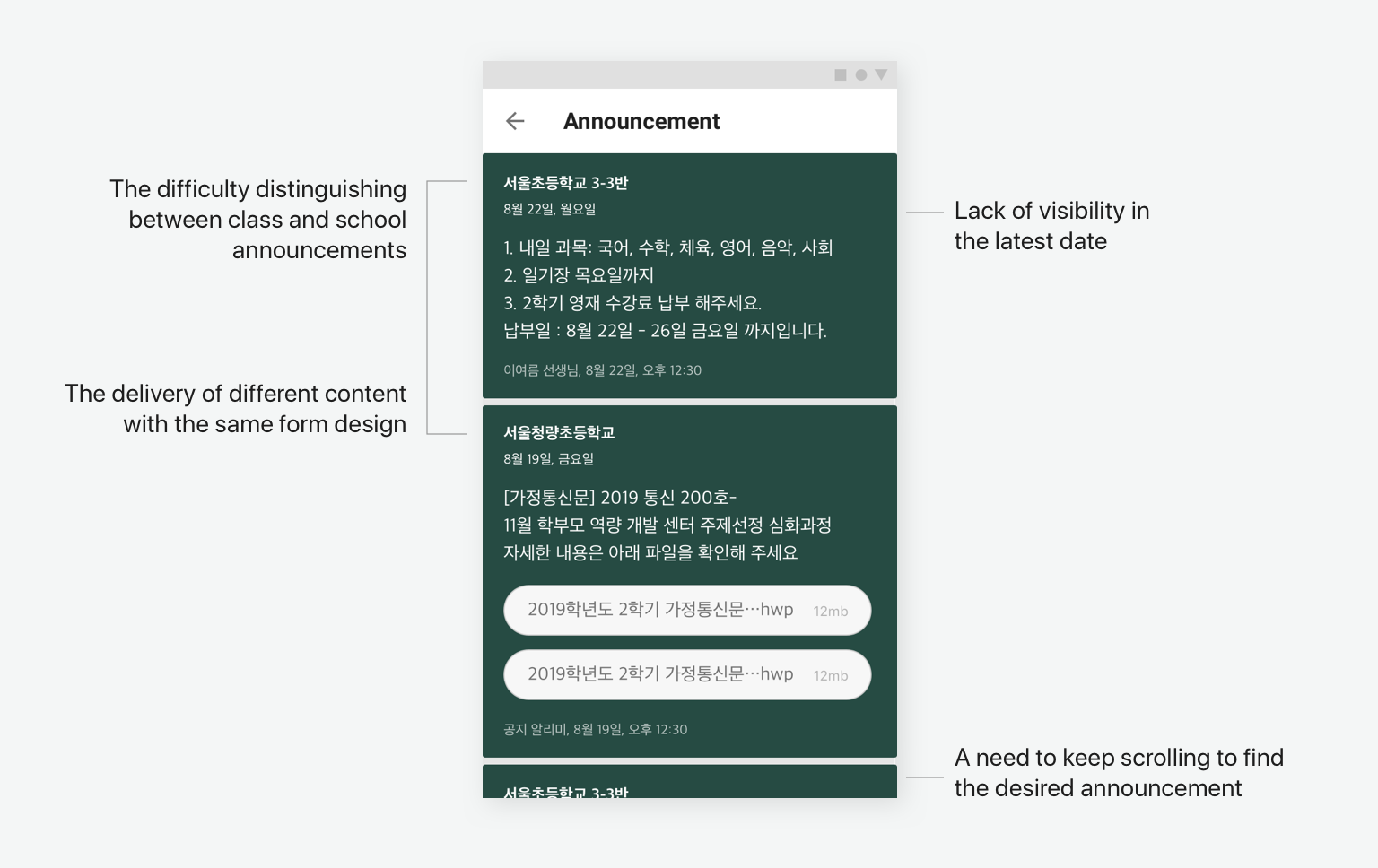 The announcement page is complicated as it delivers school and class announcements and parents' notices on one page. The purpose of this function is the efficient delivery of a large amount of information related to the school. There is various content on the announcement page, so it is not easily readable at a glance. Thus, the lack of readability is the main reason for its shortcomings. The announcement is one of the app’s main features and presents an excellent opportunity to create a more meaningful experience for our customers by overcoming the following.