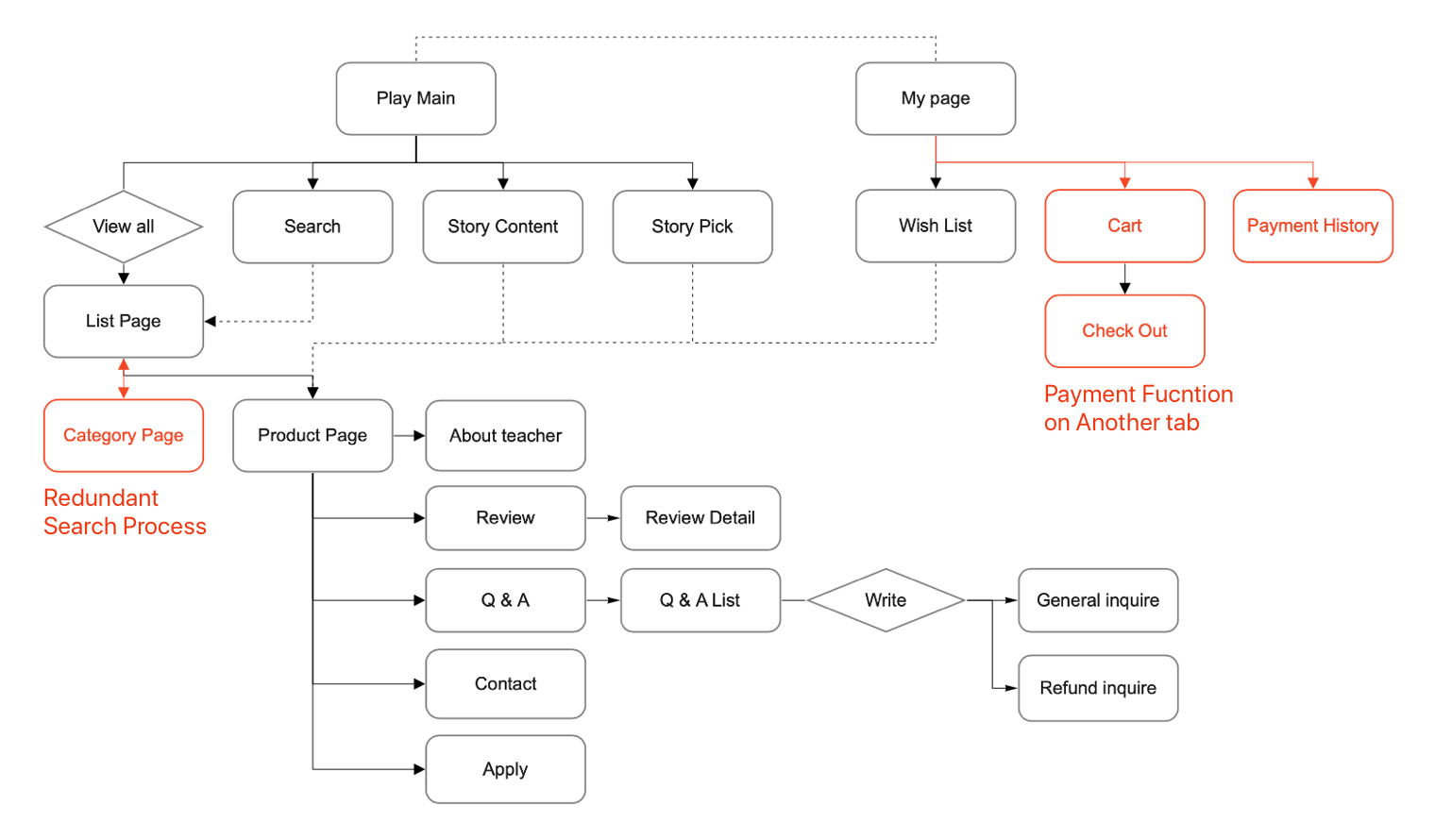 The problem is, there are a large number of pages, and some were designed inconveniently. I drew the IA of the tab to figure out the current structure. I included the entire product structure in this, which allowed me to identify where the problems existed.