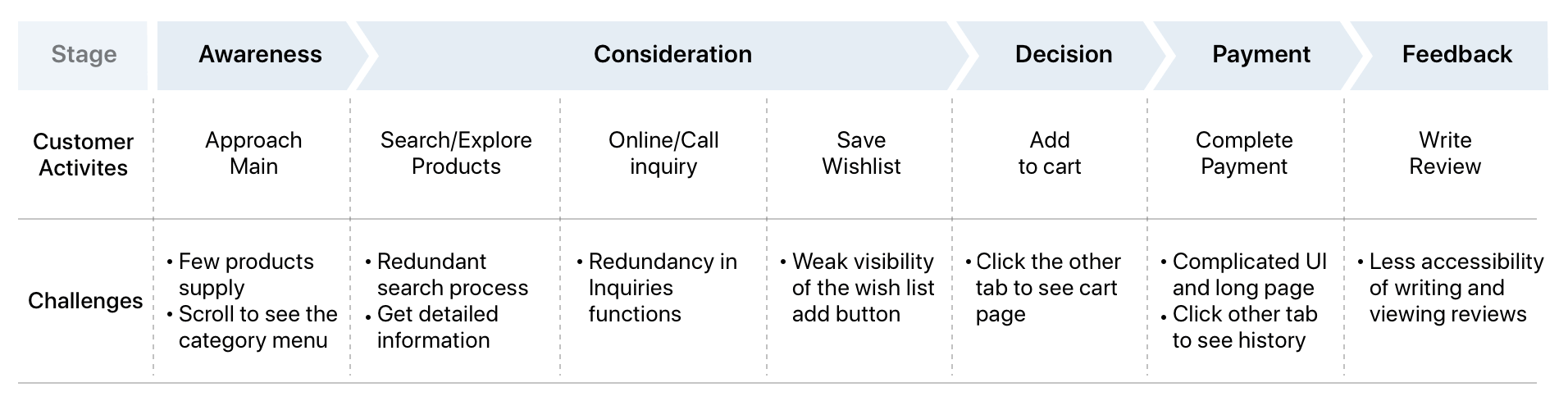 I organised a concise user journey map according to the user experience flow. These processes let us identify where customer pain points are and which parts have more impact on the business goal. After aligning with the PM and product MD, we decided which pages needed to be modified, according to priority. The first step, in which users approach the page, and the payment step leading to sales were the most important.