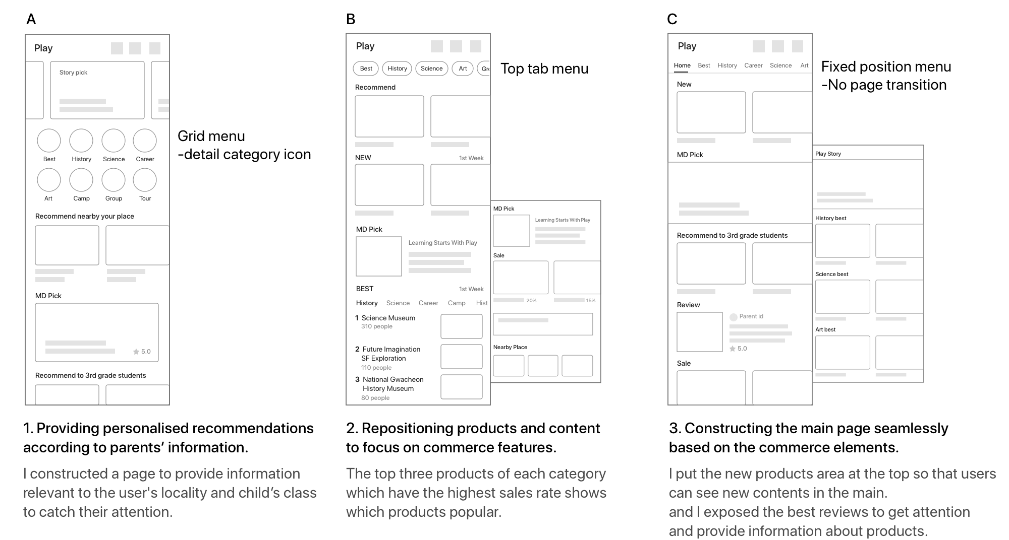 I created low-fidelity wireframes to solve the problems and discussed it with the PM and MD in charge of the product. I considered the category menu and how users conveniently use it. To provide a commerce experience that increases the purchase rate, I constructed wireframes based on user data and product sales data.